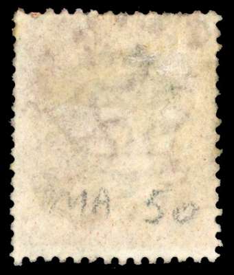 1861 1d Rose-red Pl.50 (Hand-engraved corner letters, Die II, Alphabet IV). Used example lettered MA showing error of watermark variety, cancelled by a Boston ‘94’ numeral. Scarce watermark variety on this issue. A few perforation faults. SG42var, Spec. C12(1)g. Cat £1500.
