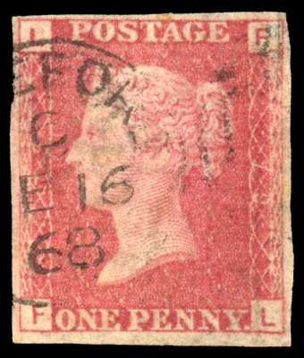 1864 1d Rose-red Pl.79 (FL). Used imperforated example lettered FL cancelled by the cds section of a Hereford ‘357’ duplex for ?E.16.1868. Slight toning and small reinforced scissor cut at top right as to be expected due to being imperforate. Scarce. SG44a, Spec. G1(1)h. Cat £2500.