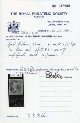 1864 1d Rose-red Pl.88 (repaired state II, QA). Very fine used huge four margin imperforate example lettered QA, cancelled by a Bristol ‘134’ numeral. Rare plate. Scarce. SG44a, Spec. G1(1)h/j. Cat £2500+. 1989 RPS Cert.