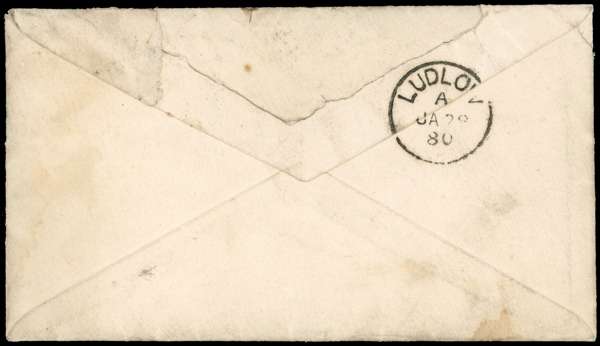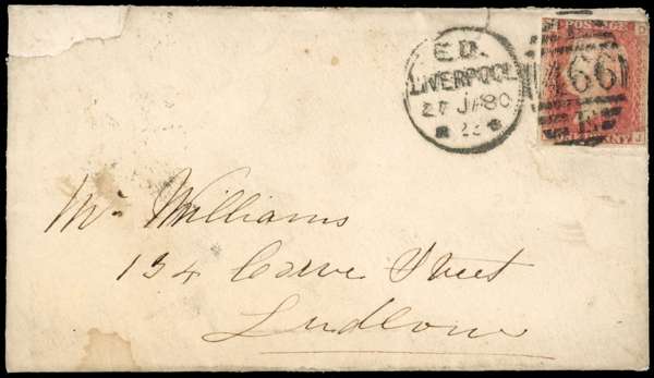 1880 1d Rose-red Pl.202. Envelope sent from Liverpool to Ludlow bearing an imperforate (SG 43a) Pl.202 lettered DJ tied by a Liverpool ‘466’ duplex. Some peripheral faults from rough opening of envelope and a few tone spots and stains affecting cover and adhesive. Original contents within. Scarce imperforate variety on cover. SG43a. Spec. G1(1)h. Cat £2500 off cover.