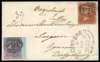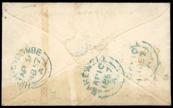 1857 Registered mail. Very fine envelope sent from High Wycombe to Eyam, Derbyshire bearing a 1d Rose (C9A, Savoy Street printing) and a 6d lilac on azure paper (SG 68a) both cancelled by High Wycombe "364" numerals with a Registered GPO datestamp for AP.9.1857. Backstamped by a High Wycombe cds for AP.9.1857, and Bakewell cds' for the following day. A presentable example of this difficult issue on cover. SG68a. Cat £950 as a single off cover.