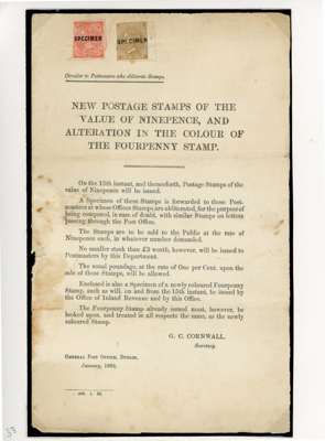 1862 (January) Postal Notice. Post Office circular for "new postage stamps of the value of ninepence, and alterations in the colour of the fourpenny stamp" bearing 4d. bright red and 9d. bistre (with wing margin) overprinted "specimen" type 6; there is a paper reinforcement behind the stamps and some light ageing. A good circular.