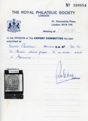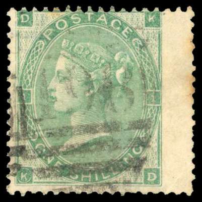 1862 1s Green Pl.1=2. (Thick paper). Used right hand wing margin example lettered KD, showing variety “K in circle“ cancelled by a Manchester ‘498’ numeral, leaving variety clear. A couple short perforations & toning to wing margin and a corner crease at lower right. SG90da. Cat £3750. 1977 RPS Cert.