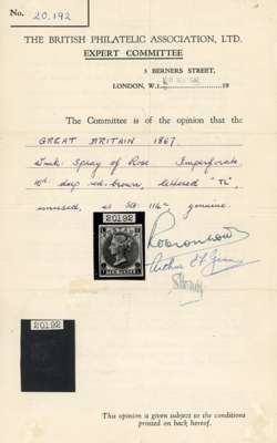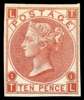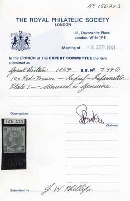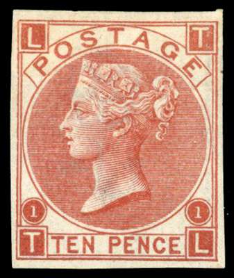 1867 10d Red brown Pl.1. Unused o.g. imperforate imprimatur lettered TL. Rare, one of only 25 possible example many of which are in institutional collections. Accompanied by a 1952 BPA Cert for an imperforate example (Incorrectly identified) and a 1991 RPS Cert for an imprimatur. SG112, Spec. J97. Cat £5000.