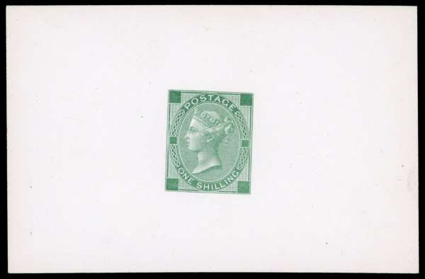 1870 1s Die proof without corner letters or plate numbers printed in green on white matt card (92 x 60mm). Produced by DLR for display at the 1870 International Exhibition. Very rare, only two or three examples are believed to exist in each colour. SG117. Cat £7,500.