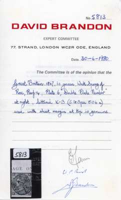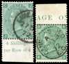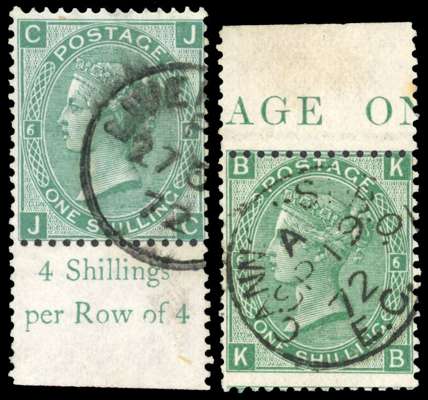 1872 1s Green Pl.6. Two fine marginal used examples showing double plate number varieties lettered JC (doubled at left) and KB (doubled at right) cancelled by cds cancellations. attractive examples of these unusual and difficult varieties. SG117. Spec. J106a. Cat. £800.