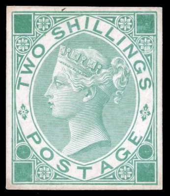 1867 2s Die proof. Very fine cut to stamp size example printed in green on glazed card without corner letters or plate numbers, produced by DLR for the 1867 Paris Exhibition. Very rare. SG118. Cat £9000.