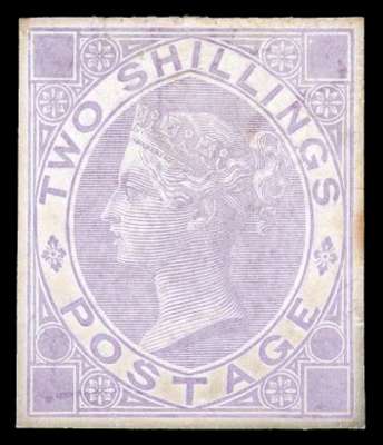 1867 2s Die proof printed in mauve on white glazed card with corner squares and plate numbers void (Cut to size, 20 x 24mm) produced for the 1867 Paris Exhibiton. Scarce. Cat £7500 full size. SG118var.