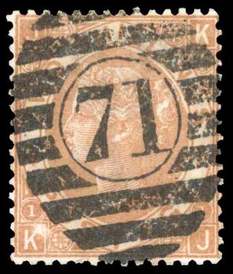 1880 2s Brown Pl.1. Example of the famous Sperati forgery lettered KJ, printed on genuine spray watermarked paper, cancelled by a London district "71" numeral. A lovely example of the only Great Britain stamp forged by the infamous Jean de Sperati. SG121. Cat £750.