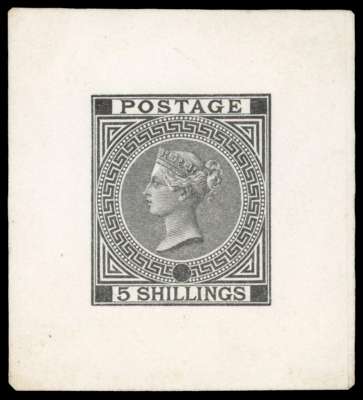 1870 5s Die proof printed in black on white matt card (49 x 54mm), produced by DLR for the 1870 International Exhibition. Scarce. SG126. Cat £5,000.