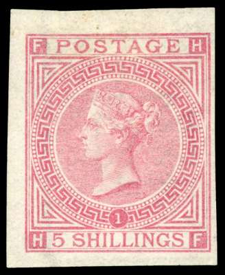 1867 5s Pale rose Pl.1. Unused o.g. close to huge four margin imperforate example lettered HF. Very rare, an exceptional example. SG127a. Spec. J121a. Cat £10,000.