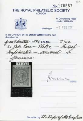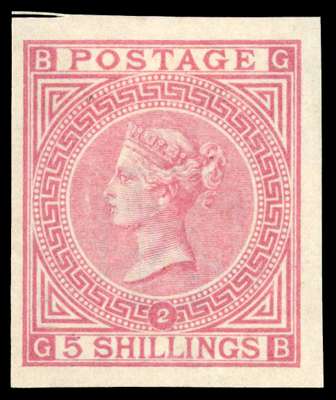 1867 5s Pale rose Pl.2 (GB). Unused o.g. imperforate imprimatur. Rare, one of only 24 possible examples many of which reside in institutional collections. 2001 RPS Cert. SG127, Spec. J122. Cat £18,000. Ex. Royal Philatelic Collection.