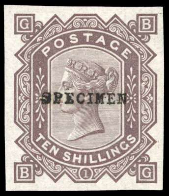 1878 10s Colour trial (BG). Unused o.g. imperforate example printed in brown, overprinted "SPECIMEN" type 9. SG128. Cat £2400.