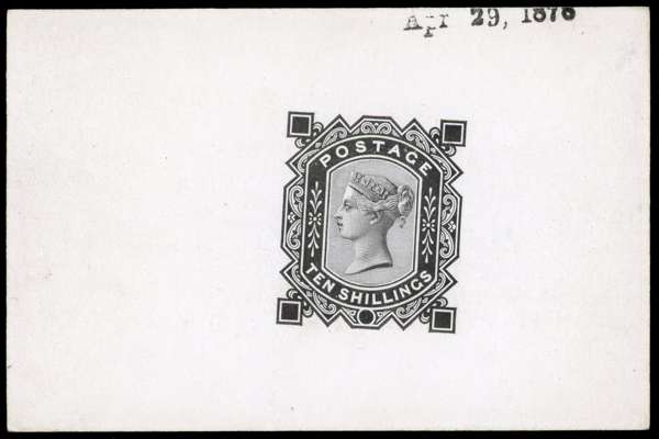 1878 10s Die proof. Printed in black on white glazed card (92 x 60mm) dated at upper right "Apr 29, 1878". Scarce. SG128. Cat £3,500.
