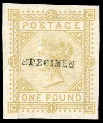 1878 £1 Colour trial Pl.1. (CC). Imperforate example printed on gummed watermarked paper in bistre, overprinted "SPECIMEN" type 9. SG129var. Cat £2,700.