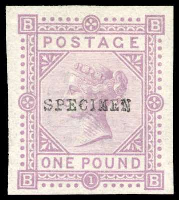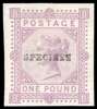 1878 £1 Colour trial Pl.1. (BB). Imperforate example printed on gummed watermarked paper in mauve, overprinted "SPECIMEN" type 9. SG129var. Cat £2,700.