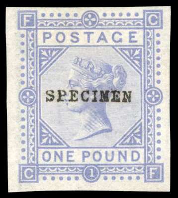 1878 £1 Colour trial Pl.1. (CF). Imperforate example printed on gummed watermarked paper in blue, overprinted "SPECIMEN" type 9. SG129var. Cat £2,700.