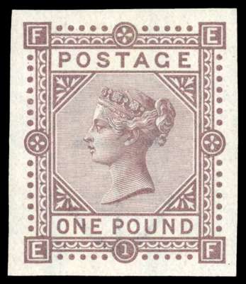 1882 £1 Brown-lilac Pl.1 (Wmk. Large Anchor on slightly blued paper). Unused o.g. imperforate imprimatur lettered EF on large anchor watermark, slightly blued paper. Very rare, one of only 21 possible examples many of which are in institutional collections. SG132, Spec. J127. Cat £55,000.