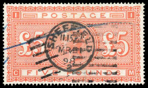 1882 £5 Orange Pl.1 (CM). Used well centred example cancelled by a crisp Sheffield cds for MR.31.1898 with partial lined dumb cancellations and blue crayon marks at left. Lovely fresh colour. SG137. Cat £3,500.