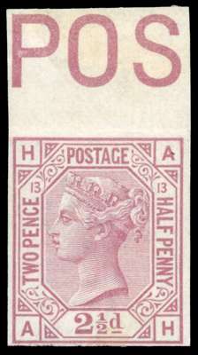 1876 2½d Rosy mauve Pl.13 (Wmk. Orb). Unused o.g. top marginal imperforate imprimatur lettered AH. Scarce, one of only 22 possible examples, many of which are in institutional collections. SG141, Spec. J14. Cat £2,500.