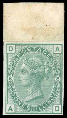 1873 1s Green Pl.8 (Wmk. Spray). Unused o.g. top marginal imperforate imprimatur lettered AD. Scarce, one of only 22 possible examples, many of which are in institutional collections. SG148, Spec. J108. Cat £3,500.
