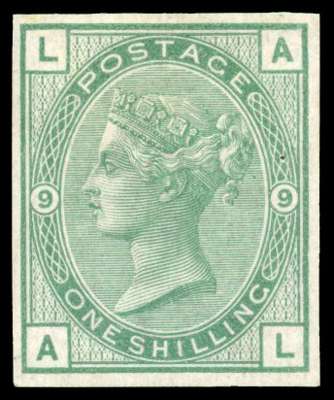 1873 1s Green Pl.9 (Wmk. Spray). Unused o.g. imperforate imprimatur lettered AL. Scarce, one of only 22 possible examples, many of which are in institutional collections. SG148, Spec. J109. Cat £3,500.