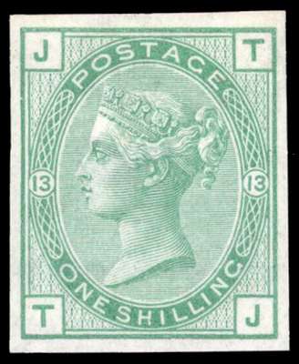1873 1s Green Pl.13 (Wmk. Spray). Unused o.g. imperforate imprimatur lettered TJ. Scarce, one of only 22 possible examples, many of which are in institutional collections. SG150, Spec. J113. Cat £3,500.