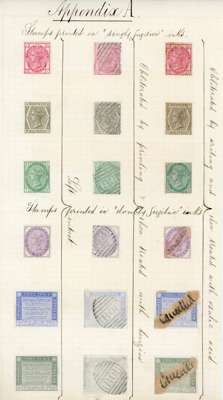 C.1878 DLR Fugitive ink "Appendix" sheet (184x310mm). Sheet bearing eighteen adhesives split into single and double fugitive ink groups. Nine postage stamps at top (3x SG143 Pl.19, 3x SG147, Pl.15 & 3x SG150, Pl.13) endorsed above “Stamps printed in singly fugitive ink” below consisting of another group of nine (3x 1d Fiscal, 6x Electric Telegraph Company labels) endorsed “Stamps printed in doubly fugitive inks”. First column of six as standards, the second column “Obliterated by printing and treated with benzine” and the final column endorsed “Obliterated by writing and then treated with oxalic acid”. A spectacular sheet showing the enhanced safety features of fugitive inks.
