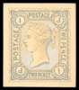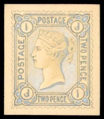 1880 2d Hand Painted Essay. Superb example produced by DLR for the proposed 1880 issue, painted on card (24x28mm) in blue, grey and white lettered IJ-JI. six essays from the DLR archives for the 2d value were sold in 1976, four of which were purchased by and are now held in The Postal Museum. SG168. Cat. £11,500.