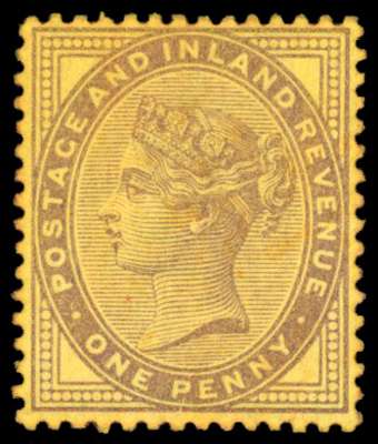1881 1d Lilac (Die II) Colour Trial on coloured paper. Unused perforated example printed in purple on yellow gummed "Crown" watermarked paper. Scarce. SG172. Cat £3,000.