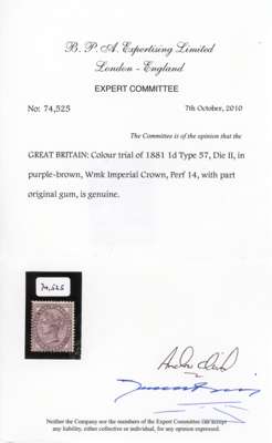 1881 1d Lilac (Die II) Colour Trial. Unused perforated example printed in purple-brown on gummed "Crown" watermarked paper. Scarce. SG172. Cat £3,250. 2010 BPA Cert.