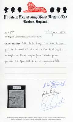 1884 2s6d Deep lilac (Blued paper from white paper period). Very fine used example lettered GG, cancelled by a Constantinople ‘C’ numeral. Scarce issue. SG179a, Spec. K10(2)a. 1991 PEGB Cert. Cat. £3,000.
