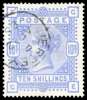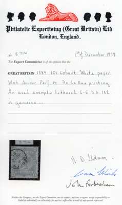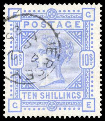 1884 10s Cobalt (White paper). Used example lettered GE, neatly cancelled by a Jersey cds for AP.22.1885. A lovely example of this rare Victorian shade. SG182, Spec. K14(1). 1999 PEGB Cert. Cat £7,500.