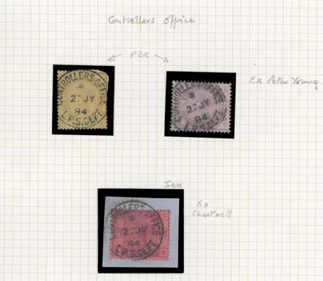 1884 1½d, 2d & 2½d Colour trials for "Coloured paper scheme. Fine group of three examples consisting of a 1½d Purple on yellow, 2d purple on red and 2½ purple on pink, all unwatermarked paper. Each cancelled by crisp Controllers Office, L.P.S. Dept trial datestamps for JY.22.1884 from T. Jeffrey, Head London Postal Service. Very scarce, 1½ with perf faults at top right. SG188, 189 & 190. Cat £3000+. (3)