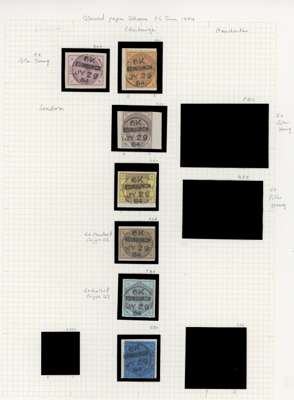 1884 1½d, 2d, 2½d & 3d Colour trials for “Coloured paper scheme”. Fine group of seven examples on piece, consisting of 2x 1½d Purple on orange (IB) & Purple on grey (GC), 2d purple on yellow (JF), 2½ purple on pink (JH) & Green on buff (JG) and 3d purple on pale blue (ID) and Purple on deep blue (FC) all on unwatermarked paper. Each cancelled by crisp 6K/Edinburgh trial datestamps for JY.29.1884 from Mr. Cunynghame, Postmaster, Edinburgh. Very scarce. SG188, 189, 190 & 191. Cat £8400+. (7)