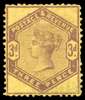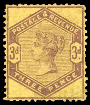 1884 3d Colour trials on coloured paper (No Wmk. Line Perf. 14). Unused o.g. colour trial without corner letters printed in purple on yellow gummed, unwatermarked paper. A few damaged perforations as usually seen on these rare colour trials. Listed on Page 253 on SG QV specialised Volume 1, 16th edition. SG190var. Cat £5,000.