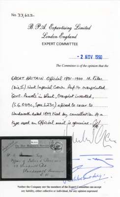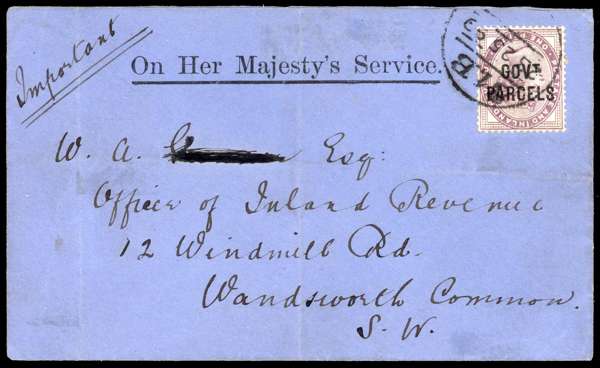 1897 1d Lilac (Govt. Parcels). Very fine O.H.M.S. blue envelope addressed to “Office of Inland Revenue”, Wandsworth Common bearing an 1d lilac (Govt. Parcels) showing overprint inverted cancelled by 1899 cds cancellation. A magnificent example of this extremely rare departmental variety. SGO69c. Spec. L23c. 1990 BPA Cert. Cat £3500 as a used single of this variety.