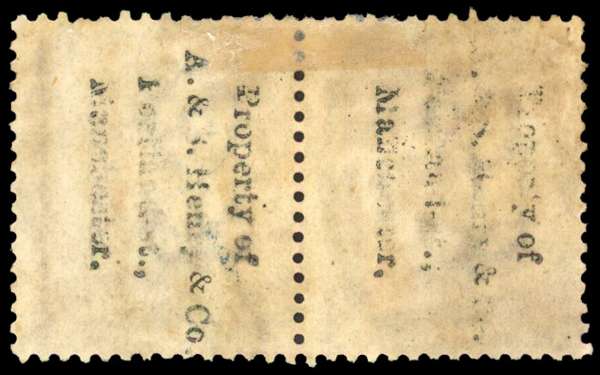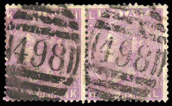 1864 A. & S. Henry & Co. Manchester unofficial underprints. Used horizontal pair of 6d Violet Pl.6 (HK-HL) with underprint in black reading Downwards. Scarce multiple. SG107. Spec. PP152. Cat £1,150.