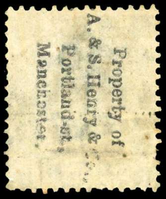 1864 A. & S. Henry & Co. Manchester unofficial underprint. Used 1s Green Pl.4 (IL) with underprint in black reading Downwards, cancelled by Manchester numeral and datestamp. Scarce. Spec. PP153. Cat £675.