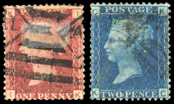 1866 Hugh Jones & Co, London unofficial underprints. Two used examples with underprint reading upwards in black, 1d Rose-red Pl.115 (IK) and a 2d Blue Pl.13 (KC) Spec. PP160 & PP161. Cat £1,200. (2).