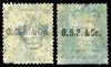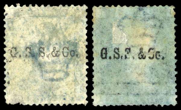 1868 G.S.S. & Co unofficial underprint. Two used 2d Blue examples with horizontal underprint in black. Pl.13 (GH) damaged on obverse and Pl.15 (TJ) thinned and creased. Scarce. Spec. PP275. Cat £1,100.