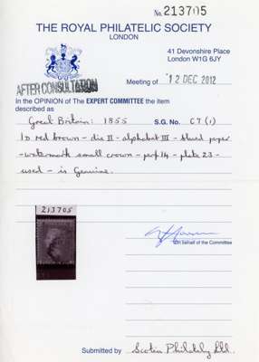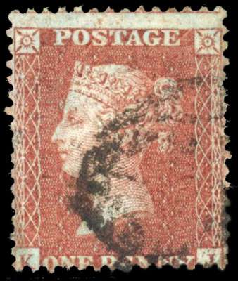 1855 1d Red-brown Pl.23 (Die II, Alphabet III, Wmk. Small Crown, Perf 14). Used example lettered KJ (Gothic K), cancelled by an Indistinct numeral. A few tatty/pulled perforations nevertheless a presentable example of this difficult issue. SG29var, Spec. C7(1). 2012 RPS Cert. Cat £850.