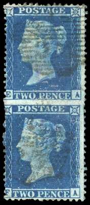 1857 2d Blue Pl.6 (SG35, Die I, Alphabet III, Wmk. Large Crown, Perf 14). Used vertical pair lettered EA-FA showing magnificent imperforate between vertical pair variety with partial indents at right ,each cancelled by a London numeral. Minor perf faults, staining yet a most unusual and very interesting piece. Similar to the only other recorded pair imperf between lettered RD-SD. SG35, Spec. F7j. Cat £12,500 as imperf between.