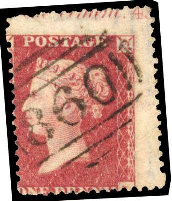1857 1d Rose-red Pl.43 (Die II, Alphabet III, Wmk Large Crown, Perf 14). A wonderful used example extremely off centre and showing plate number “43” at top right of stamp, cancelled by a Wellington ‘860’numeral. Very parculiar. SG40, Spec. C10.