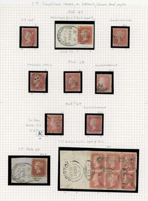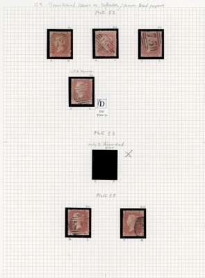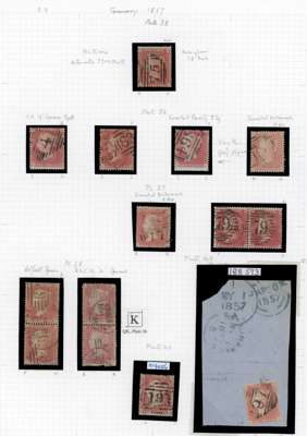 1857 1d Pale red Pl.27-55 (Die II, Alphabet III, Wmk. Large Crown Perf 14 Crema/white paper). A wonderful fifty nine used examples consisting of ten watermark inverted examples, some of the more difficult plates, multiples, varieties, re-entries and unusual/dated cancellation pieces etc. Some faults but a spectacular study from this transitional pre-fire post fire period of 1857. SG38/var, Spec. C9/9A.