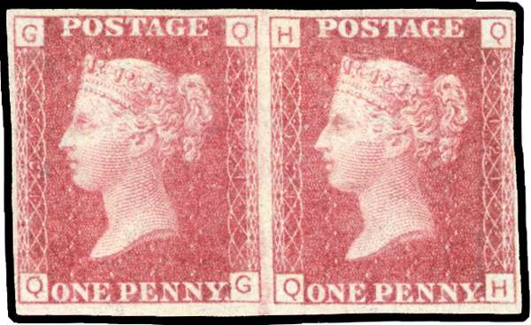 1864 1d Rose-red Pl.121. Unused o.g. horizontal pair printed on Dr. Perkins blued security paper lettered QG-QH just shaved at right. SG43var Spec. G1i. Cat £9,000.