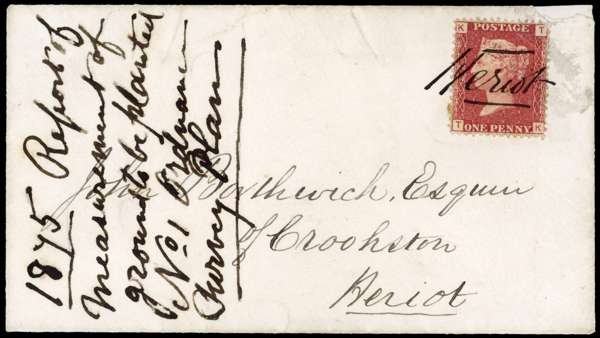 1869 1d Rose-red Pl.122. Envelope addressed to Heriot (Scottish borders) bearing a 1d Rose-red Pl.122 (SG43) tied by a manuscript ‘Heriot’ obliteration with arrival filling endorsements at left. Unusual, most likely due to local mailing and no handstamp available. SG43. 1987 RPS Cert.