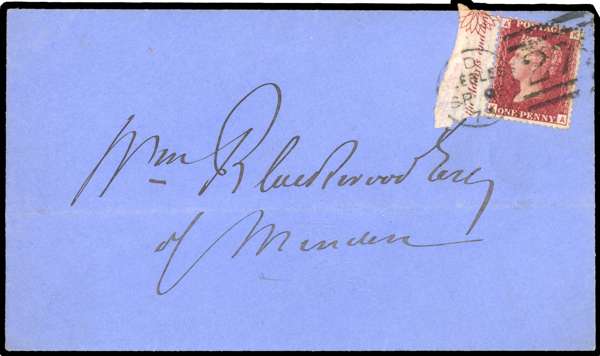 1871 1d Rose-red Pl.145. Clean blue envelope bearing a left hand marginal 1d Rose-red Pl.145 lettered KA showing central sheet ornament tied by a Peebles ‘279’ Scottish duplex for SP.06.1873. A very attractive positional piece on cover. SG43, Spec. G1(1).