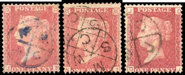 1857-79 1d Rose-red issues (SG 40x2 & SG43). Trio of used examples all cancelled by London Mis-sent ‘Hot Cross Bun’ handstamps with one example in blue and two in black. Wonderful examples of these scarce District instructional handstamps. SG40, 43.