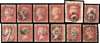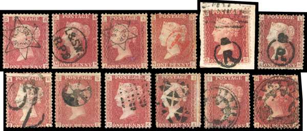 1864-79 1d Rose-red ‘Penny Plate’ issue. A spectacular group of twelve 1d Rose-reds (SG43) all cancelled by scarce or unusual cancellations including handstruck ‘2’, inspector marks, mail bag seals, railway cancellations and crowned ‘R’ redirection handstamps. Minor faults to some but overall a wonderful group with magnificent strikes. SG43, Spec. G1(1).